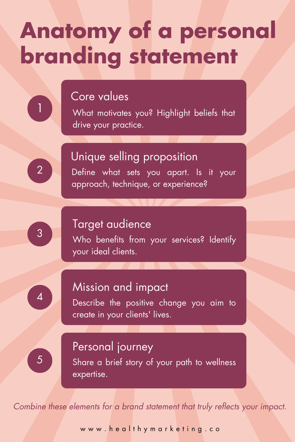 A personal brand statement is a succinct and powerful declaration that encapsulates your professional identity, values, and the unique benefits you offer in your field. It's a reflection of your mission and the impact you aim to have on your clients and the broader wellness community. This statement is your professional mantra, guiding your actions and communications, ensuring they align with your core beliefs and specialties.